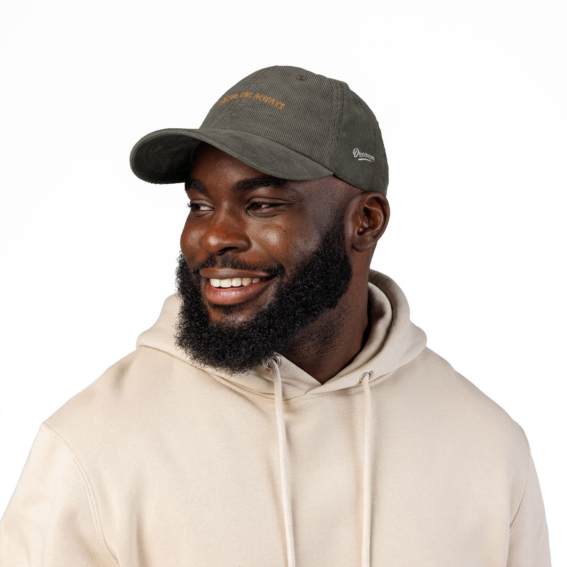 This soft corduroy cap brings a warm, lived-in vibe to everyday wear. The low-profile, unstructured crown sits comfortably on the head, while the textured cotton ribs and raised embroidery add handcrafted character. Worn slightly slouched, it reads like a favorite thrift-store find that traveled with you through lazy weekends, city walks, and late-night brainstorming sessions. The embroidered “Dream Big Always” front feels quietly motivational without shouting — a reminder to keep reaching while staying grounded. The adjustable strap with its brass-colored buckle lets you fine-tune the fit, and the cotton sweatband keeps things breathable through long days. Slip it on with a denim jacket, a cozy sweater, or a simple tee to complete a relaxed, intentional look for casual meetups, creative days, or weekend markets.